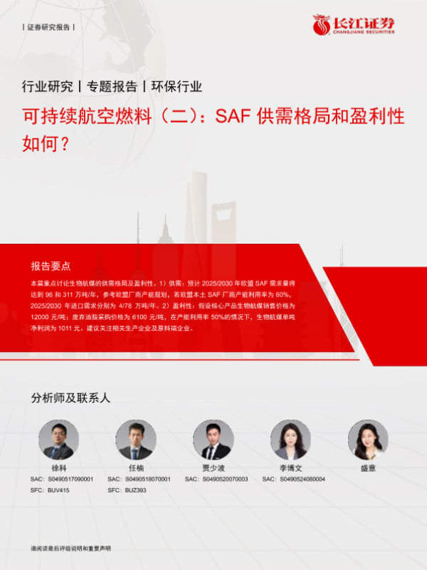 【长江证券】【20241202】环保行业可持续航空燃料(二):SAF供需格局和盈利性如何?-15页 行业研究
