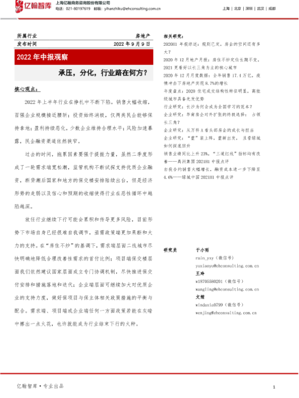 【上海亿翰商务咨询股份有限公司】【20220909】房地产:承压,分化,行业路在何方?-9页 行业研究