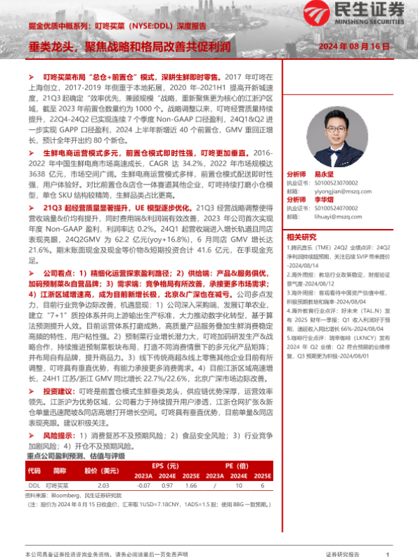 【民生证券】【202408】掘金优质中概系列:叮咚买菜(NYSE DDL)深度报告-34页 证券期货研究报告
