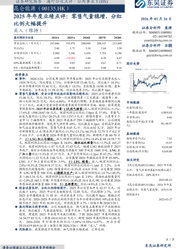 【东吴证券】【202603】昆仑能源(00135.HK):2025年年度业绩点评:零售气量稳增,分红比例大幅提升-3页 证券期货研究报告