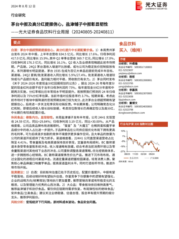 【光大证券】【20240812】20240812-光大证券-食品饮料行业周报:茅台中报及高分红提振信心,盐津铺子中报彰显韧性-10页 行业研究