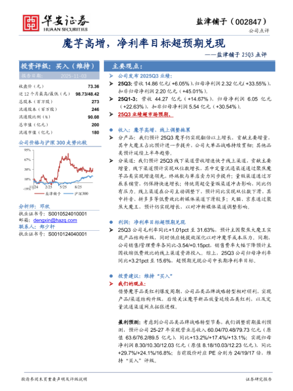 【华安证券】【202511】魔芋高增,净利率目标超预期兑现——盐津铺子 25Q3点评-4页 证券期货研究报告
