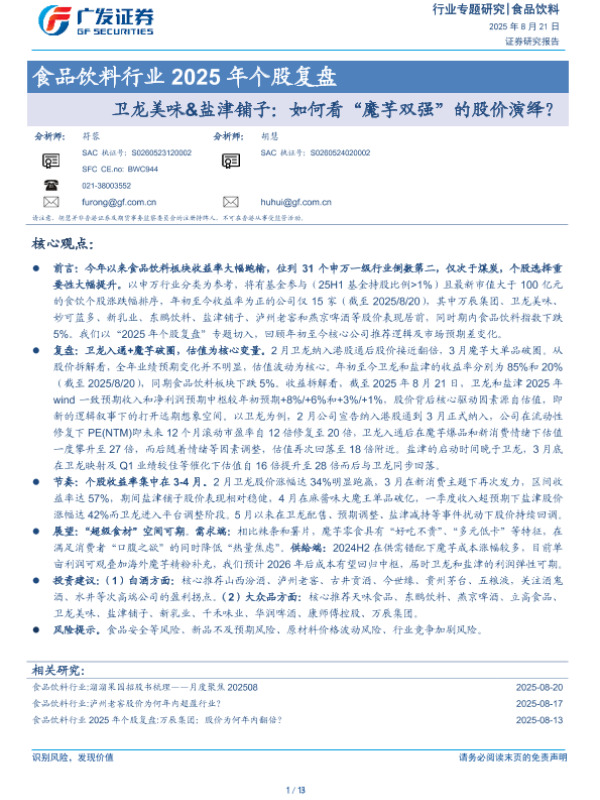 【广发证券】【202508】食品饮料行业2025年个股复盘:卫龙美味&盐津铺子,如何看“魔芋双强”的股价演绎?-13页 证券期货研究报告