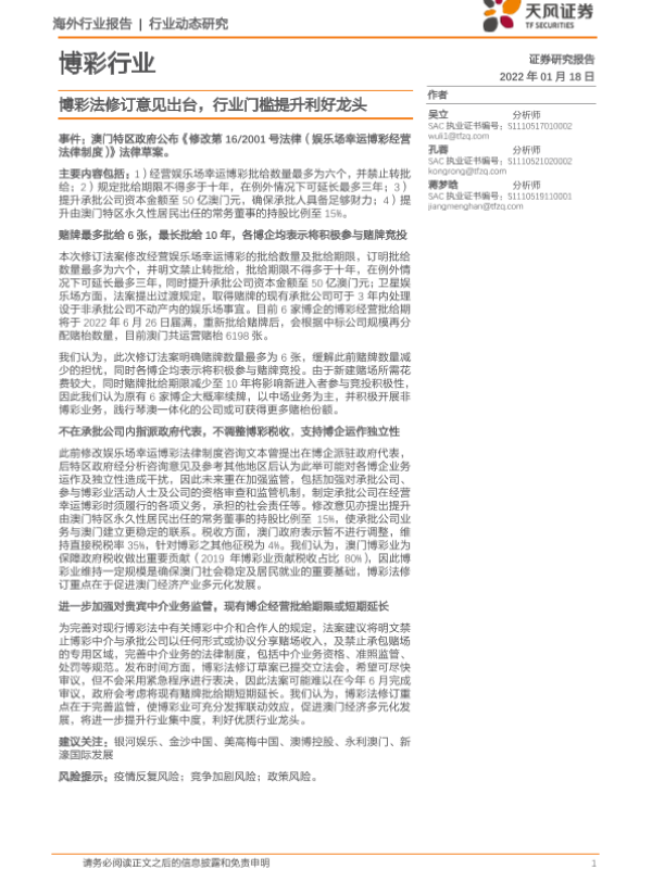 【天风证券】【20220118】博彩行业动态研究:博彩法修订意见出台,行业门槛提升利好龙头-2页 行业研究