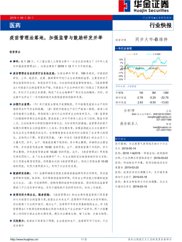 【华金证券】【20190630】疫苗管理法落地,加强监管与鼓励研发并举-3页 行业研究