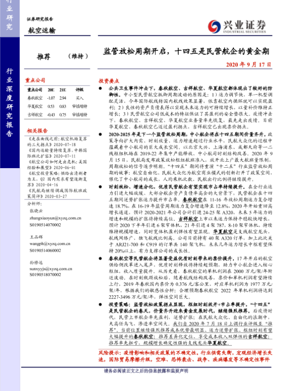 【兴业证券】【20200917】监管放松周期开启,十四五是民营航企的黄金期-38页 行业研究