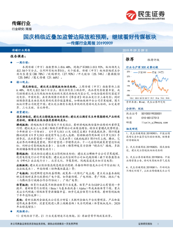 【民生证券】【20190909】20190909-民生证券-传媒行业周报:国庆档临近叠加监管边际放松预期,继续看好传媒板块-16页 行业研究