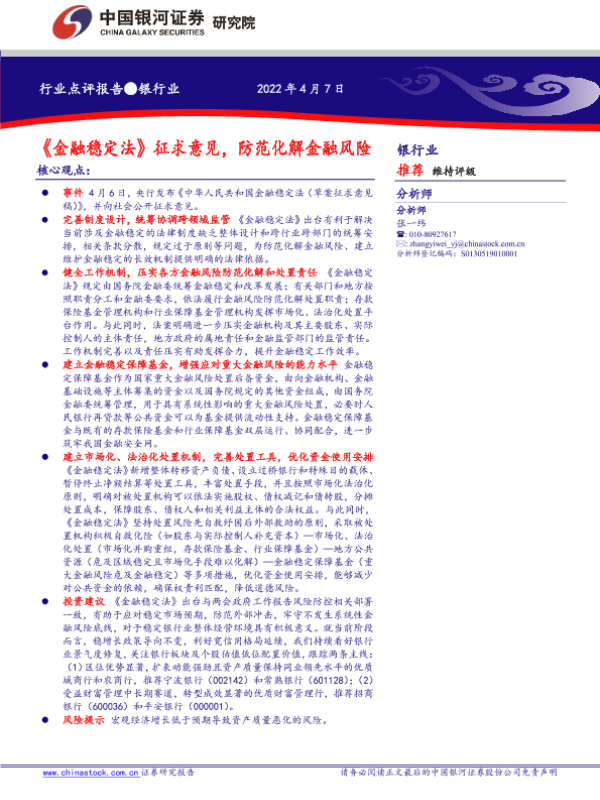 【银河证券】【20220407】银行业:《金融稳定法》征求意见,防范化解金融风险-2页 行业研究
