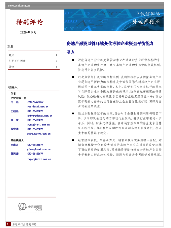 【中诚信国际】【202009】房地产融资监管环境变化考验企业资金平衡能力-5页 行业研究