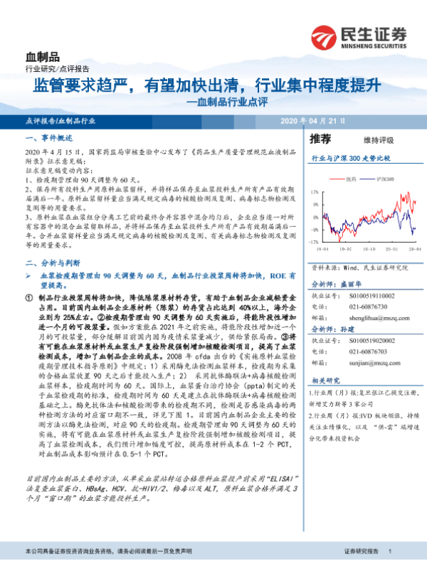 【民生证券】【20200421】血制品行业点评:监管要求趋严,有望加快出清,行业集中程度提升-4页 行业研究