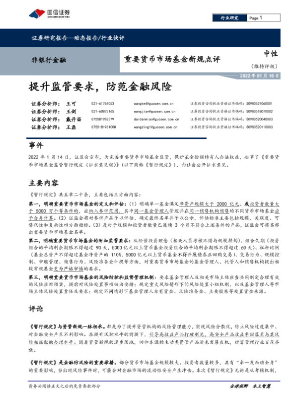 【国信证券】【20220116】非银行金融重要货币市场基金新规点评:提升监管要求,防范金融风险-4页 行业研究