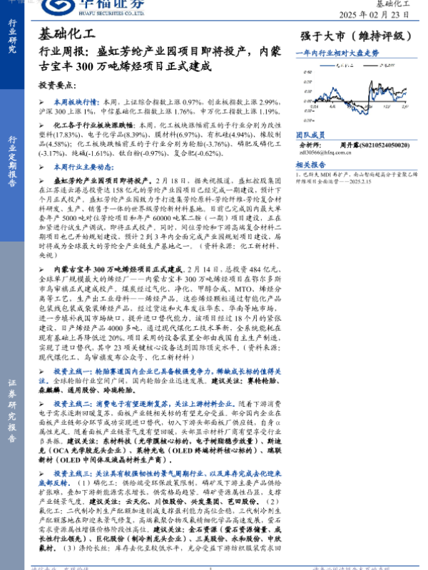 【华福证券】【20250223】基础化工行业周报:盛虹芳纶产业园项目即将投产,内蒙古宝丰300万吨烯烃项目正式建成-22页 行业研究