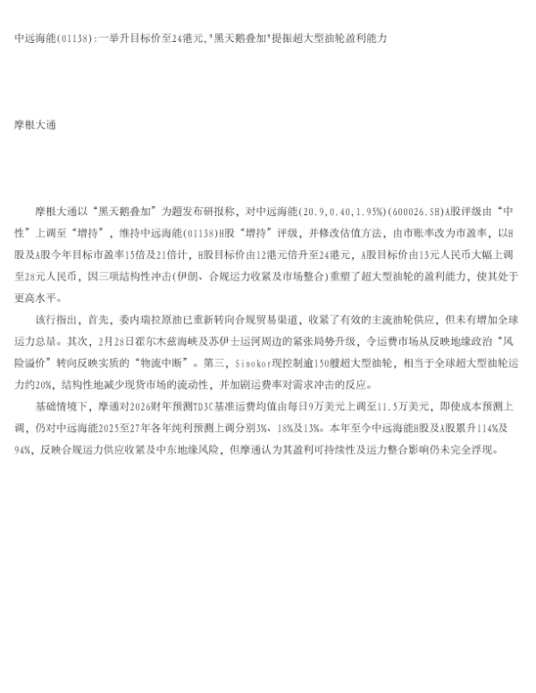 【J.P. Morgan】【2026】一举升目标价至24港元,"黑天鹅叠加"提振超大型油轮盈利能力-1页 证券期货研究报告