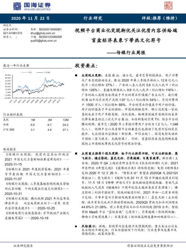 【国海证券】【20201122】20201122-国海证券-传媒行业周报:视频平台商业化变现渐优关注优质内容供给端盲盒经济表象下带热文化符号-19页 行业研究