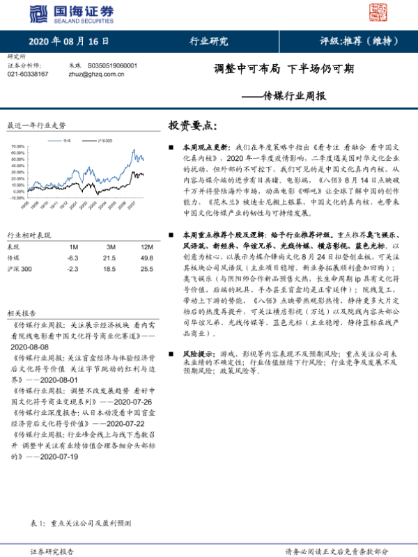 【国海证券】【20200816】传媒行业周报:调整中可布局 下半场仍可期-19页 行业研究