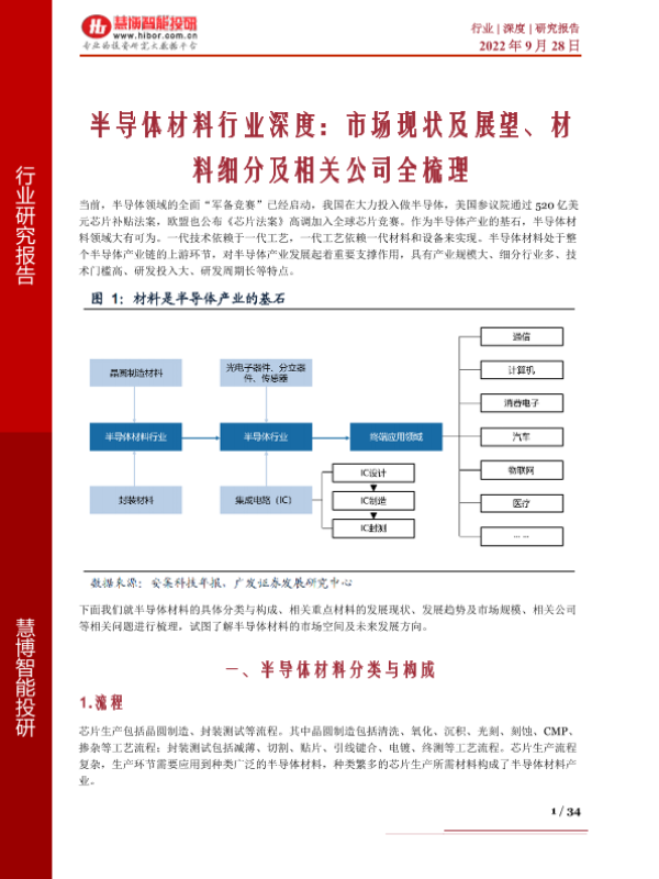 【慧博智能投研】【20220928】半导体材料行业深度:市场现状及展望、材料细分及相关公司全梳理-34页 行业研究