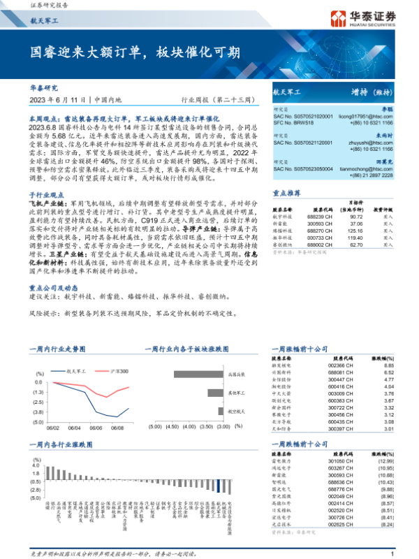 【华泰证券】【20230611】20230611-华泰证券-航天军工行业周报(第二十三周):国睿迎来大额订单,板块催化可期-15页 行业研究