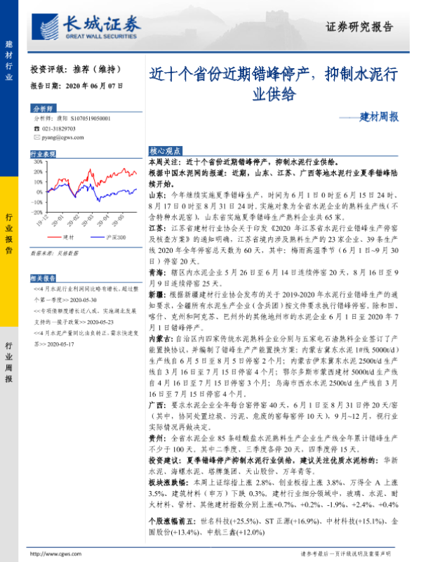 【长城证券】【20200607】近十个省份近期错峰停产,抑制水泥行业供给-17页 行业研究