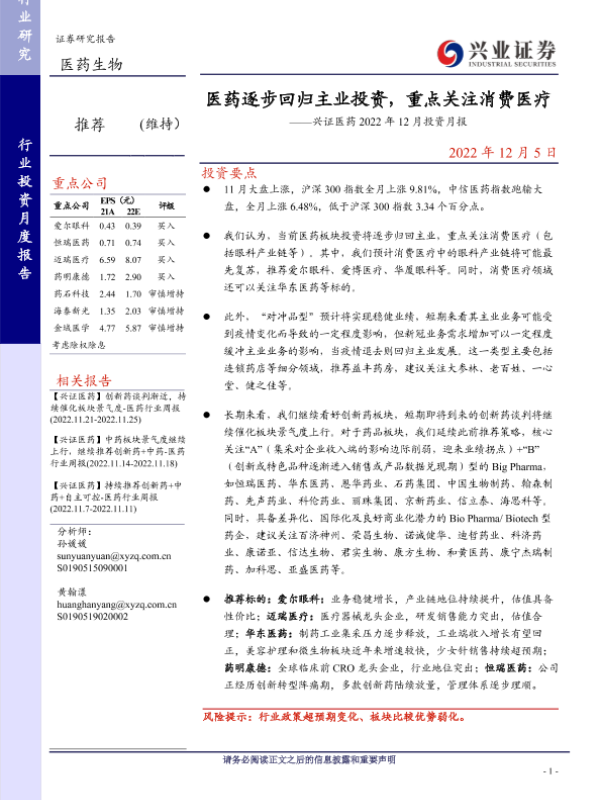 【兴业证券】【20221205】医药逐步回归主业投资,重点关注消费医疗-20页 行业研究