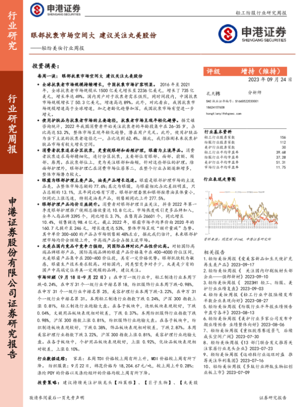 【申港证券】【20230924】轻纺美妆行业周报:眼部抗衰市场空间大 建议关注丸美股份-15页 行业研究