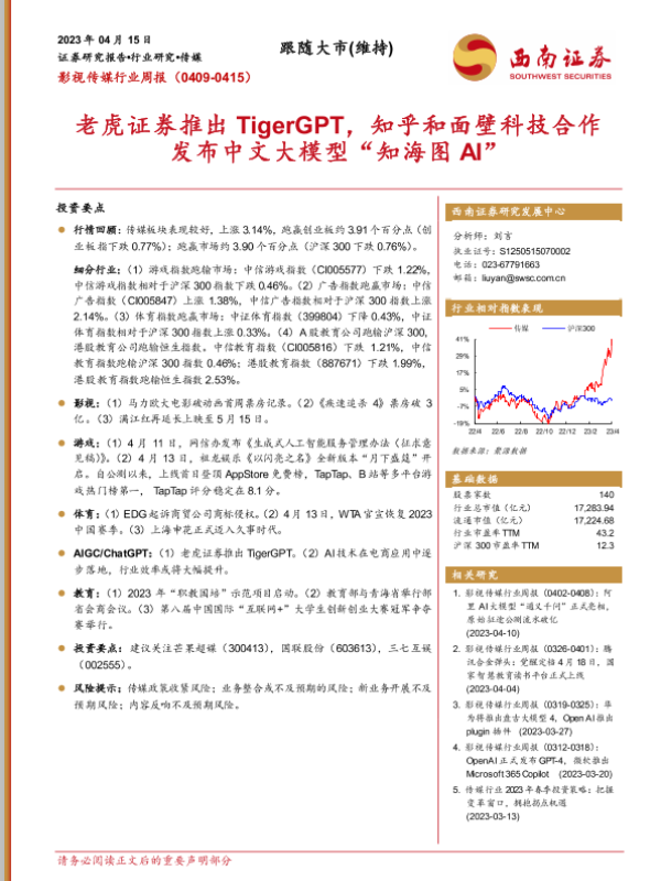【西南证券】【20230415】影视传媒行业周报:老虎证券推出TigerGPT,知乎和面壁科技合作发布中文大模型“知海图AI”-17页 行业研究