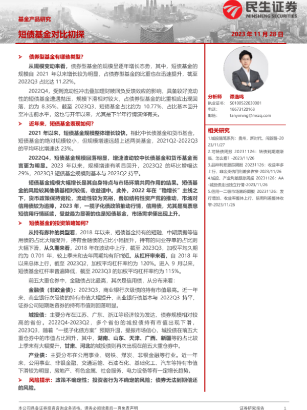【民生证券】【20231128】基金产品研究:短债基金对比初探-21页 行业研究