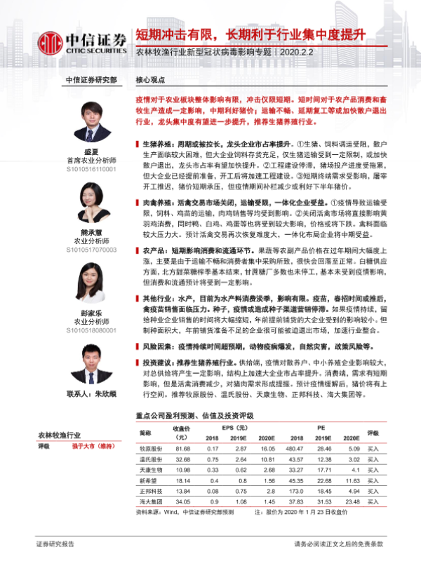 【中信证券】【20200202】农林牧渔行业新型冠状病毒影响专题:短期冲击有限,长期利于行业集中度提升-12页 行业研究