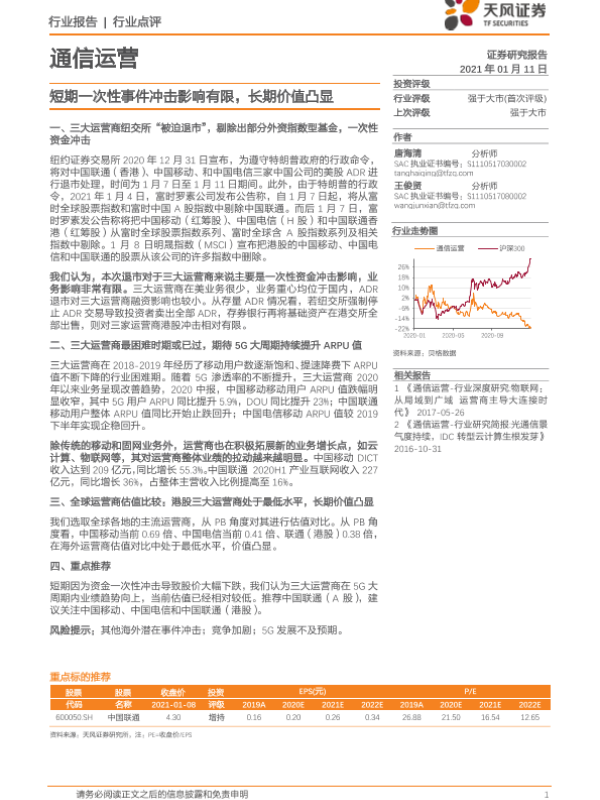 【天风证券】【20210111】通信运营行业:短期一次性事件冲击影响有限,长期价值凸显-11页 行业研究