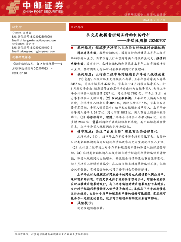 【中邮证券】【20240707】流动性:从交易数据看短端品种的机构特征-24页 行业研究