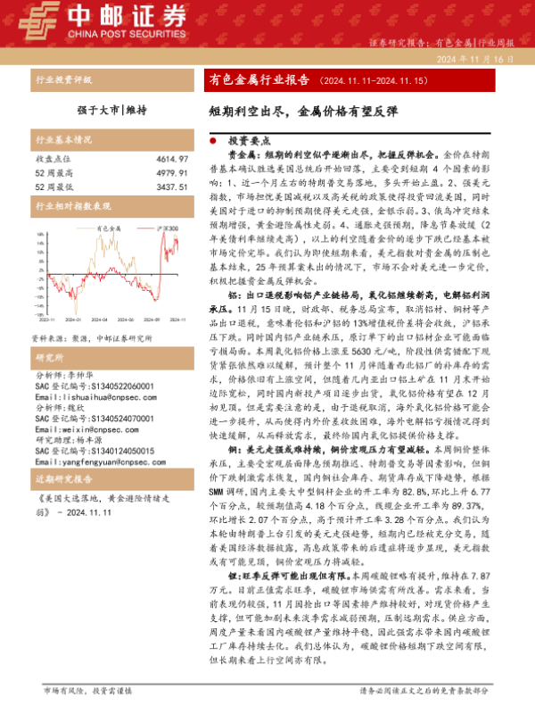 【中邮证券】【20241116】20241116-中邮证券-有色金属行业报告:短期利空出尽,金属价格有望反弹-13页 行业研究