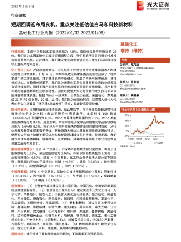 【光大证券】【20220109】20220109-光大证券-基础化工行业周报:短期回调迎布局良机,重点关注低估值白马和科技新材料-24页 行业研究