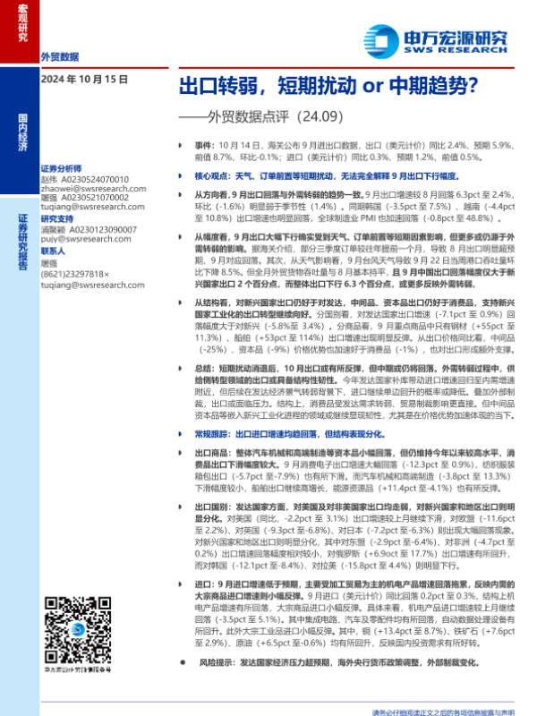 【申万宏源】【20241027】2024年10月27日更新-【申万宏源】外贸数据点评(24.09):出口转弱,短期扰动or中期趋势-10页 宏观策略