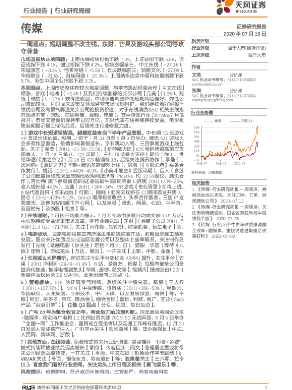 【天风证券】【20200719】传媒一周观点:短期调整不改主线,东财、芒果及游戏头部公司等攻守兼备-25页 行业研究
