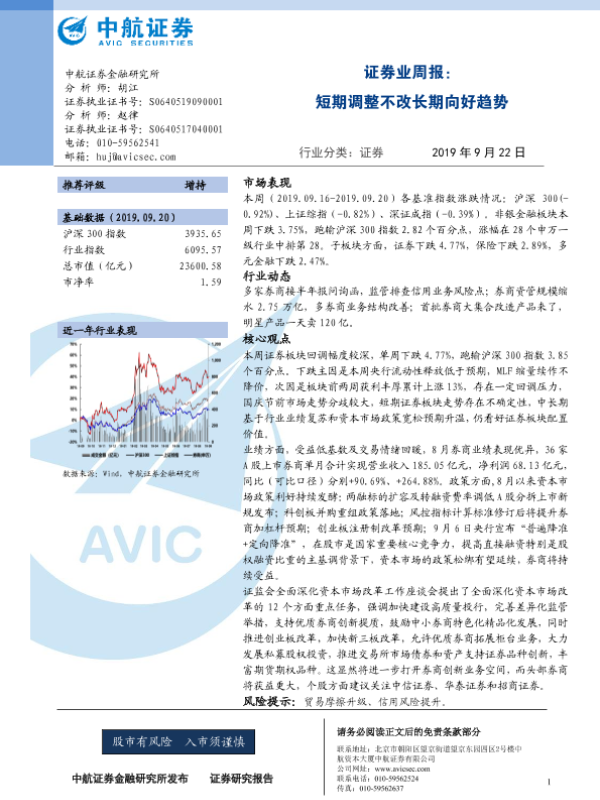 【中航证券】【20190922】证券业周报:短期调整不改长期向好趋势-11页 行业研究