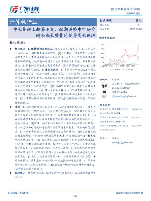 【广发证券】【20200726】计算机行业:中长期向上趋势不变,短期调整中市场空间和成长质量的差异尚未体现-8页 行业研究
