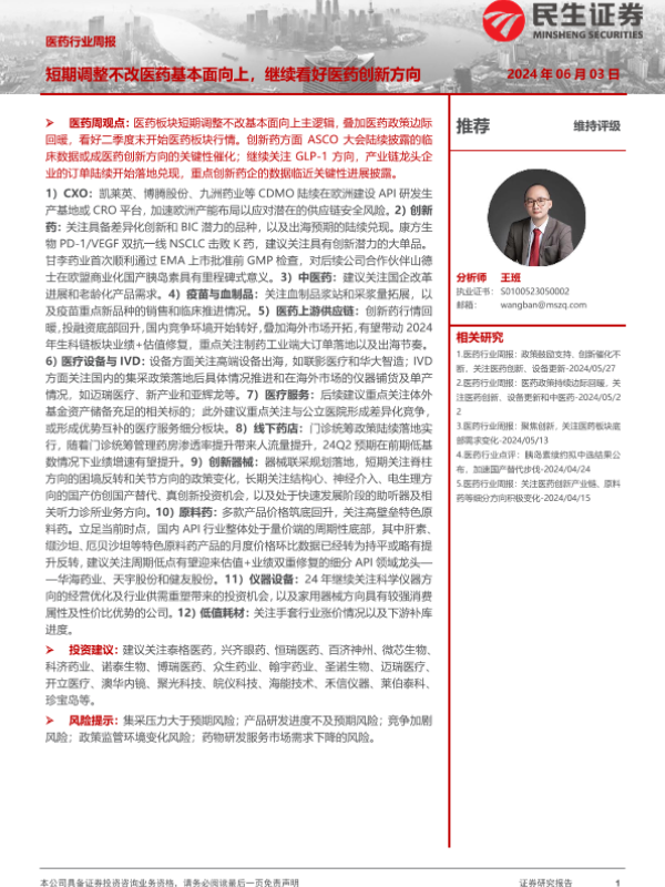 【民生证券】【20240603】医药行业周报:短期调整不改医药基本面向上,继续看好医药创新方向-23页 行业研究