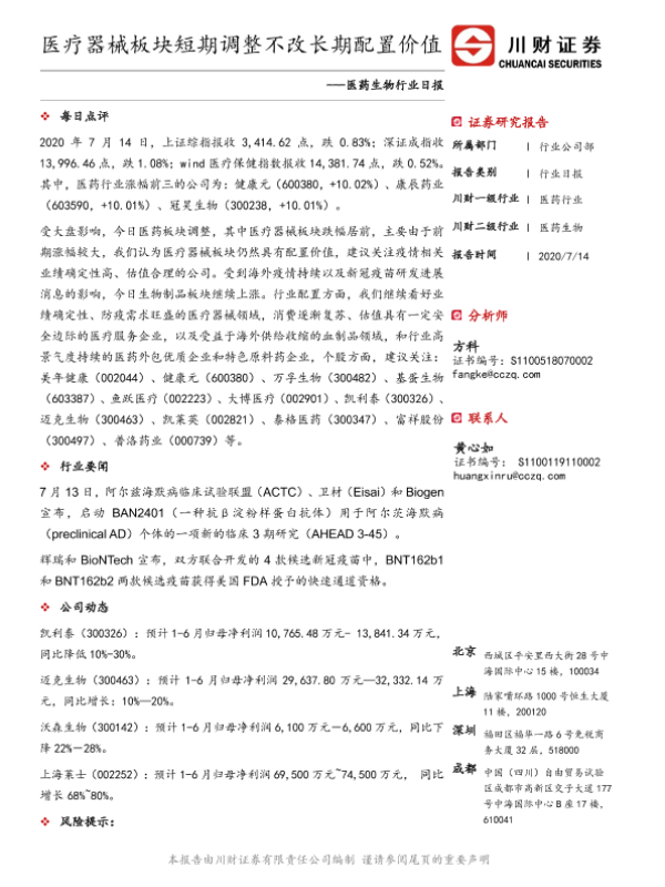 【川财证券】【20200714】医药生物行业日报:医疗器械板块短期调整不改长期配置价值-4页 证券期货研究报告
