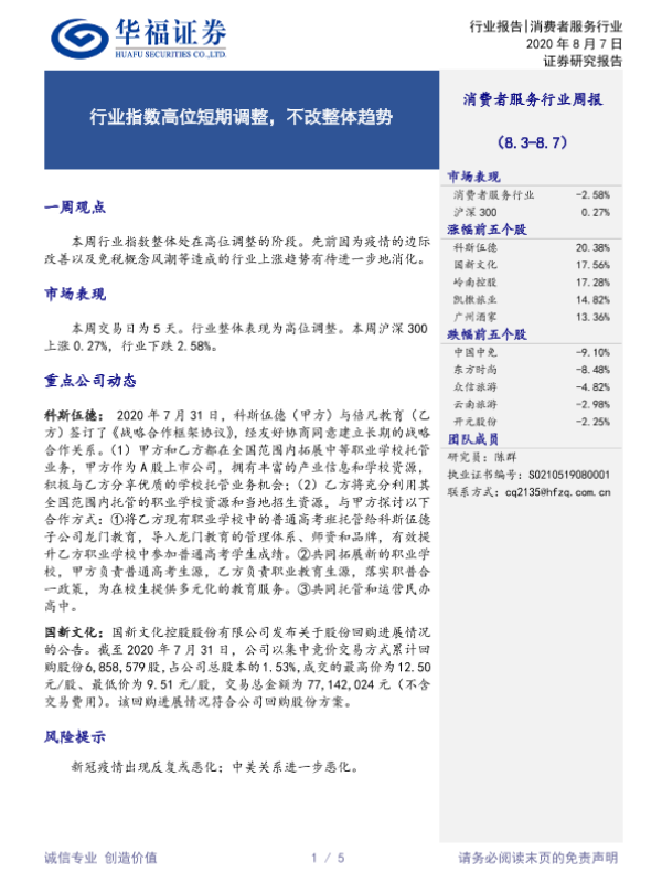 【华福证券】【20200807】消费者服务行业周报:行业指数高位短期调整,不改整体趋势-5页 行业研究