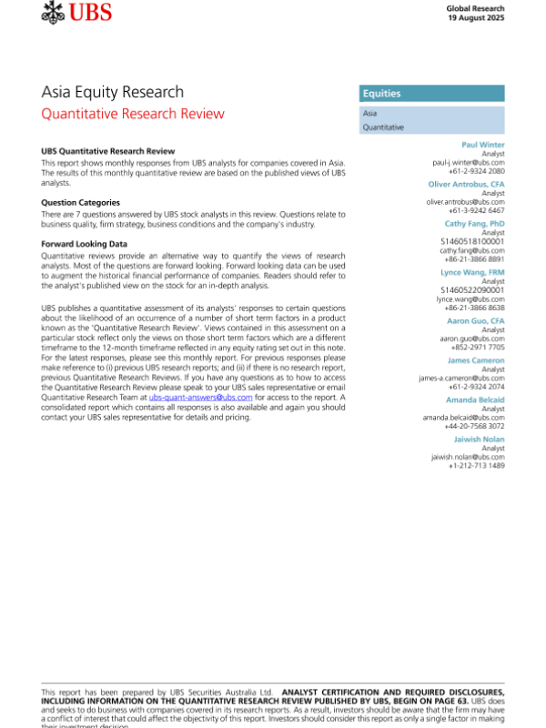 【UBS Securities Australia Ltd】【202508】Asia Equity Research Ouantitative Research Review-67页 证券期货研究报告