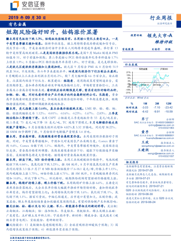 【安信证券】【20190930】20190930-安信证券-有色金属行业周报:短期风险偏好回升,钴钨涨价显著-25页 行业研究
