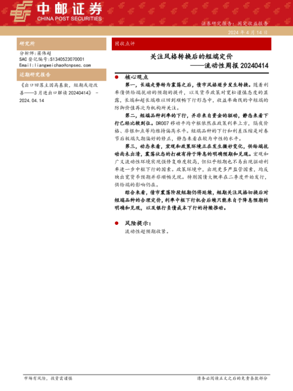 【中邮证券】【20240414】流动性:关注风格转换后的短端定价-19页 行业研究