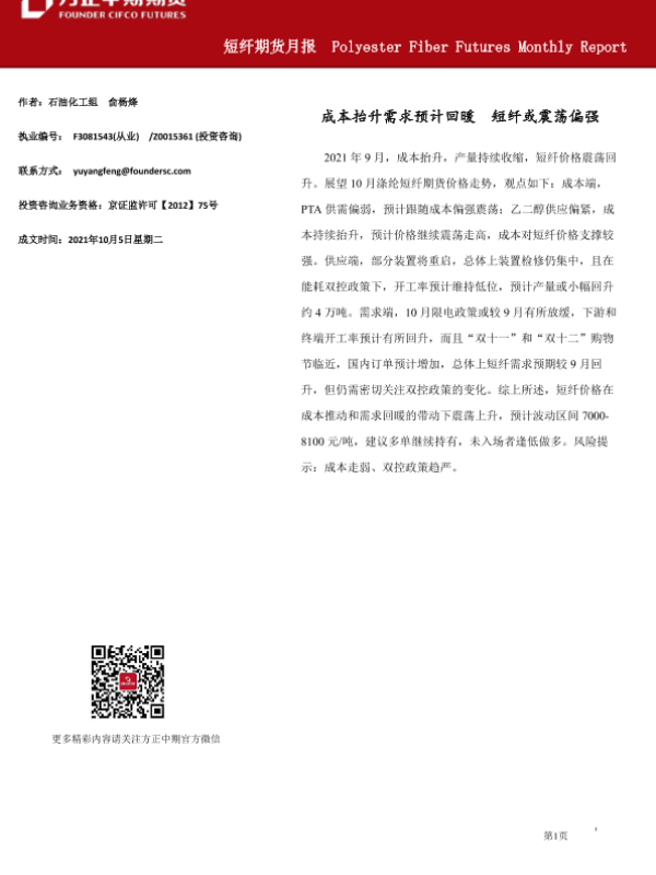 【方正中期期货】【20211005】短纤期货月报:成本抬升需求预计回暖,短纤或震荡偏强-19页 行业研究