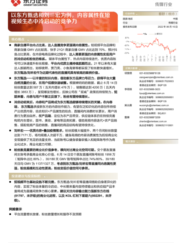 【东方证券】【20220615】传媒行业:以东方甄选和刘畊宏为例,内容属性在短视频生态中冷启动的竞争力-3页 行业研究