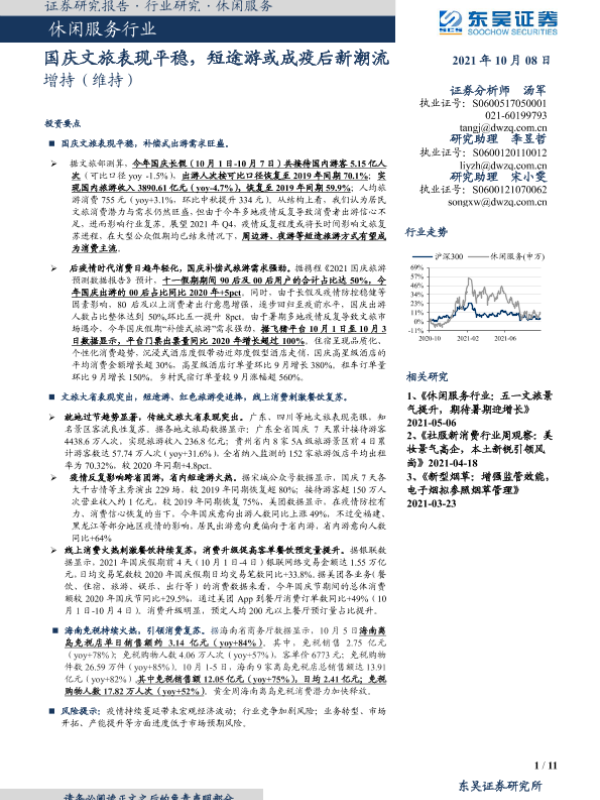 【东吴证券】【20211008】休闲服务行业:国庆文旅表现平稳,短途游或成疫后新潮流-11页 行业研究