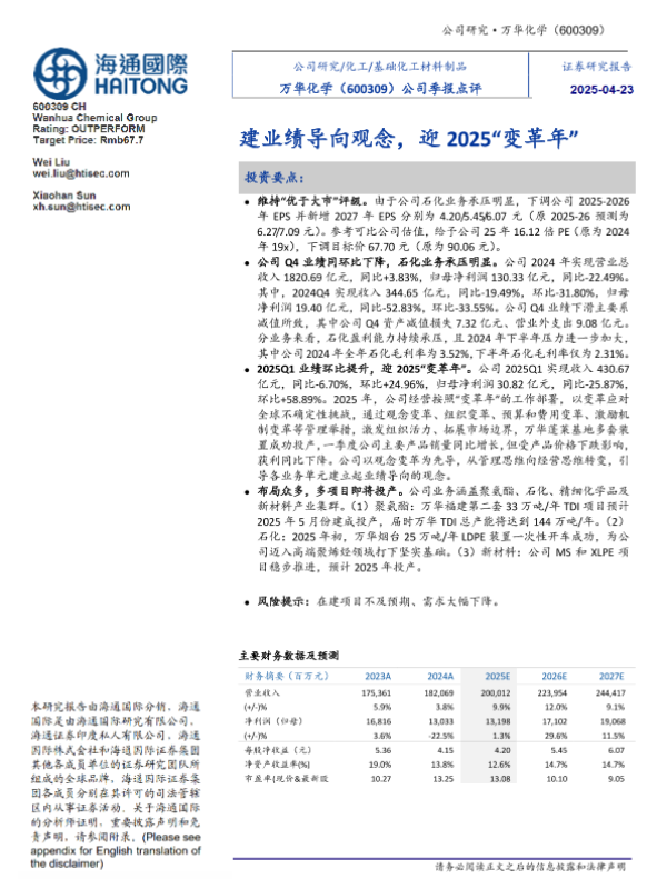 【海通国际】【20250421】万华化学(600309)公司季报点评:建业绩导向观念,迎2025“变革年”-14页 公司研究
