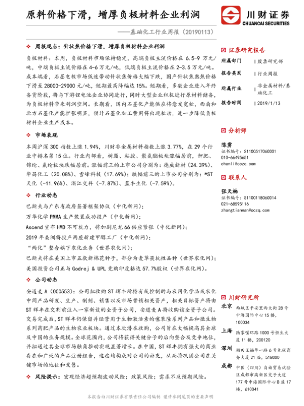【川财证券】【20190113】基础化工行业周报:原料价格下滑,增厚负极材料企业利润-21页 行业研究