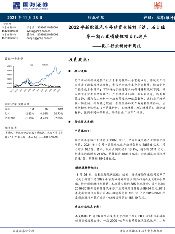 【国海证券】【20211128】20211128-国海证券-化工行业新材料周报:2022年新能源汽车补贴资金提前下达,石大胜华一期六氟磷酸锂项目已达产-33页 行业研究