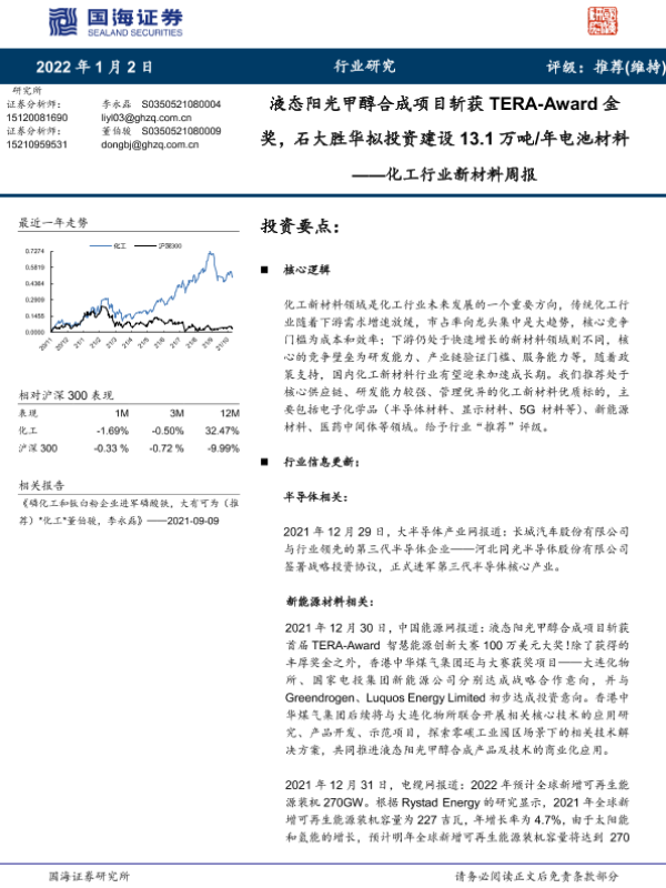 【国海证券】【20220102】20220102-国海证券-化工行业新材料周报:液态阳光甲醇合成项目斩获TERA-Award金奖,石大胜华拟投资建设13.1万吨/年电池材料-37页 行业研究