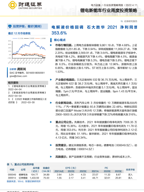 【财通证券】【20220411】锂电新能车行业周度投资策略:电解液价格回调 石大胜华2021净利同增353.6%-18页 行业研究