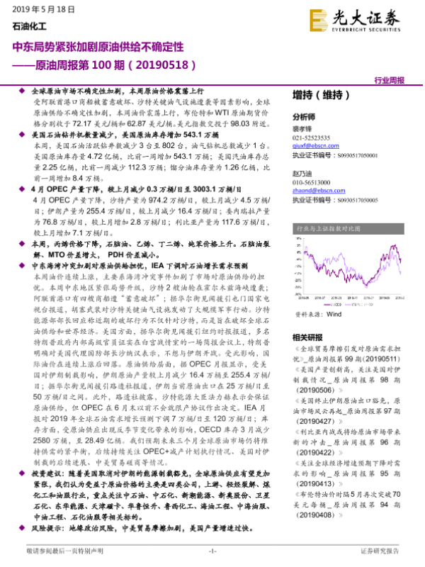 【光大证券】【20190518】原油周报第100期:中东局势紧张加剧原油供给不确定性-12页 行业研究